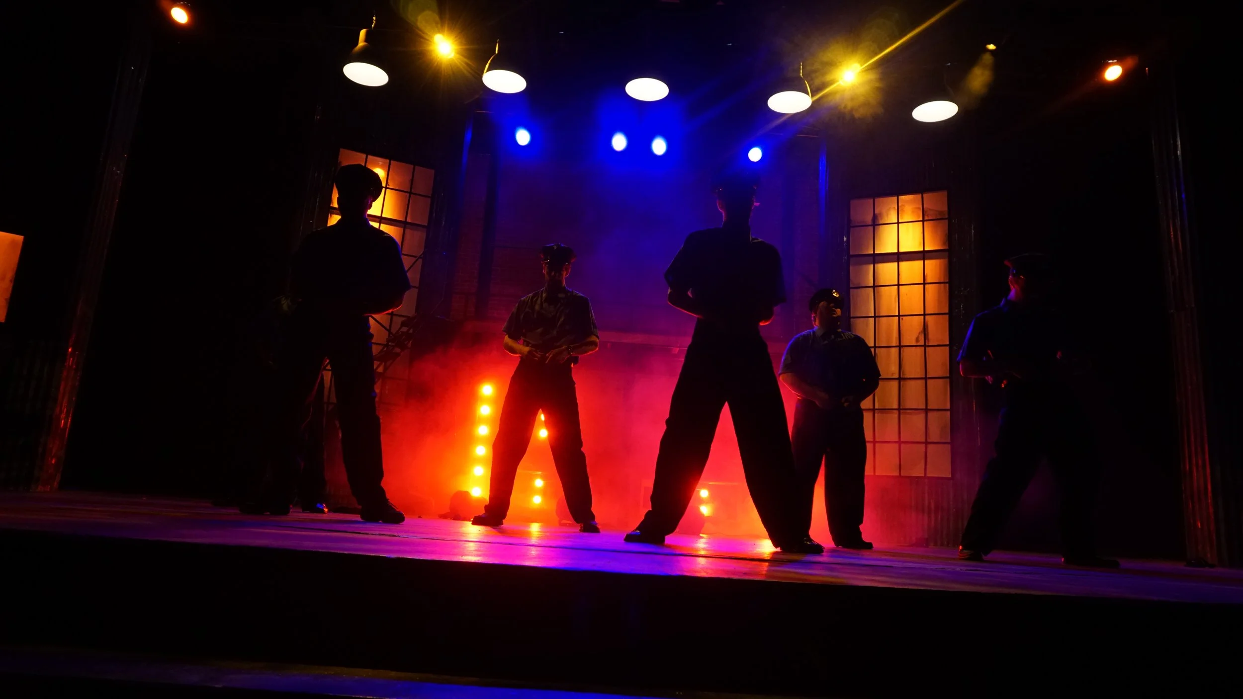 Silhouettes of five performers on stage with colorful lighting and fog, creating a dramatic scene.