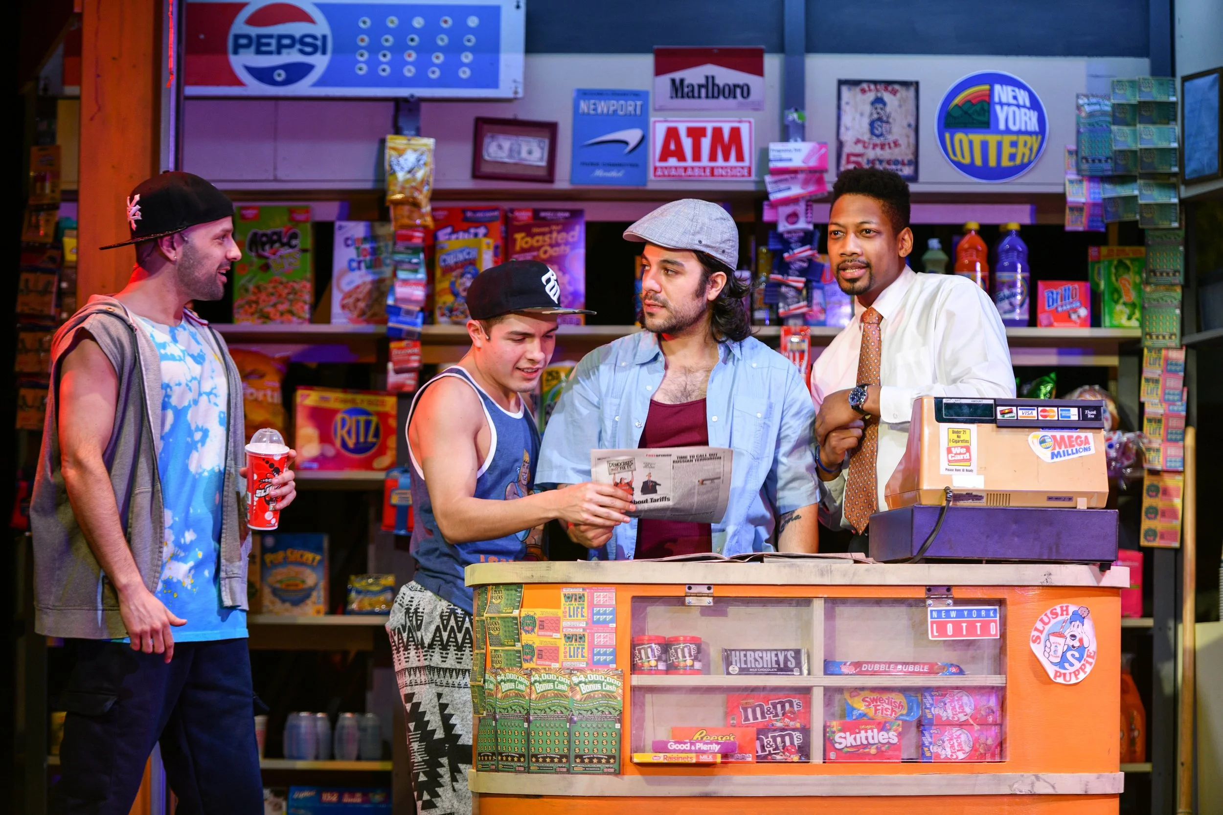 The stage of a theatrical play with multiple actors standing and sitting, set to resemble a lively urban neighborhood with storefronts including a grocery store and a beauty salon, and two women on elevated platforms. The scene features vibrant light